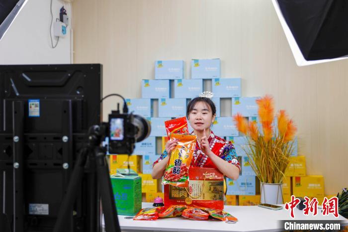 圖為貴州施秉一主播在推介熏制的臘肉、香腸等特色農(nóng)產(chǎn)品。磨桂賓 攝