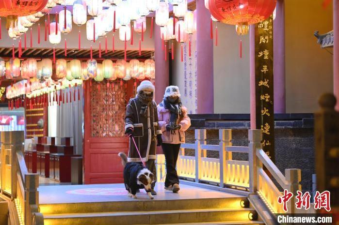 1月13日晚,甘肅敦煌夜市內,游人感受新春燈飾。中新社記者 李亞龍 攝