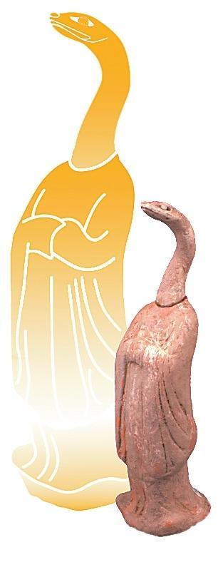 伏羲和女媧是中國神話傳說中的創(chuàng)世神靈,被視為人類文明的始祖。相傳他們均為蛇身人首的形象,象征著自然與人類的和諧統(tǒng)一。伏羲被認(rèn)為是發(fā)明八卦、結(jié)繩記事的智者,開啟了中華文明的智慧之門;而女媧則以其神力摶土造人,煉石補(bǔ)天,維護(hù)了天地的秩序。展覽中展出的高臺縣博物館館藏的一件魏晉時期的女媧圖彩繪壁畫磚。畫面繪女媧,人首蛇身,獸足,頭梳高髻,著交領(lǐng)紅裳,右手持月輪,月輪內(nèi)有蟾蜍,左手持規(guī),周圍繪云氣。同時,還展出了一件高臺縣博物館館藏魏晉時期的伏羲女媧畫像磚,左側(cè)女媧,一手持矩、一手拿陰物,人首、蛇身、獸足、挽高髻、著交領(lǐng)長衣,腹部繪月輪;右側(cè)伏羲,右手持規(guī),左手持日,內(nèi)有一金烏,周圍云氣環(huán)生,意在天界暢游。兩磚拼合形成陰陽交合圖,為墓葬中室頂部藻井彩繪圖像。畫像中人首蛇身的伏羲、女媧形象,濃縮著中國上古時代的蛇崇拜意識。我國古代有天圓地方之稱,伏羲執(zhí)規(guī)象征天,女媧執(zhí)矩象征地,反映了墓主人追隨升天的愿望,也期望其后代能夠繁衍生息。