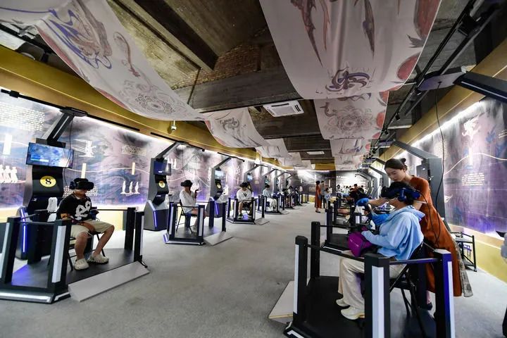 2024年7月22日,游客在敦煌體驗“尋境敦煌——數字敦煌沉浸展”。新華社記者 郎兵兵 攝