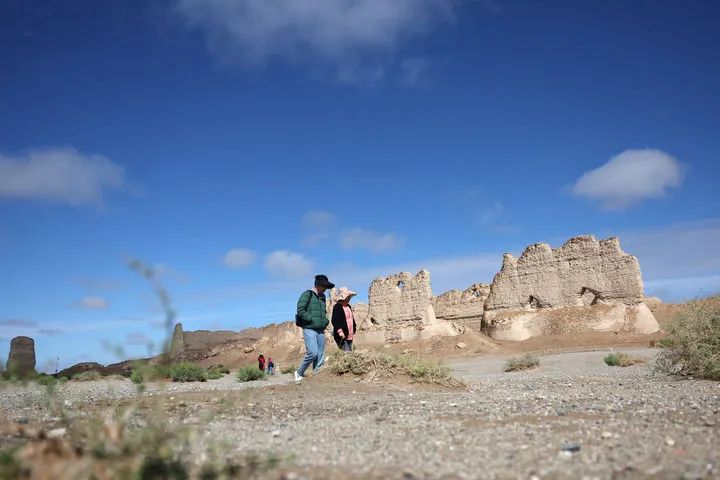 2024年9月4日,游客在雨后的玉門關遺址區(qū)大方盤城游覽。新華社記者 陳斌 攝