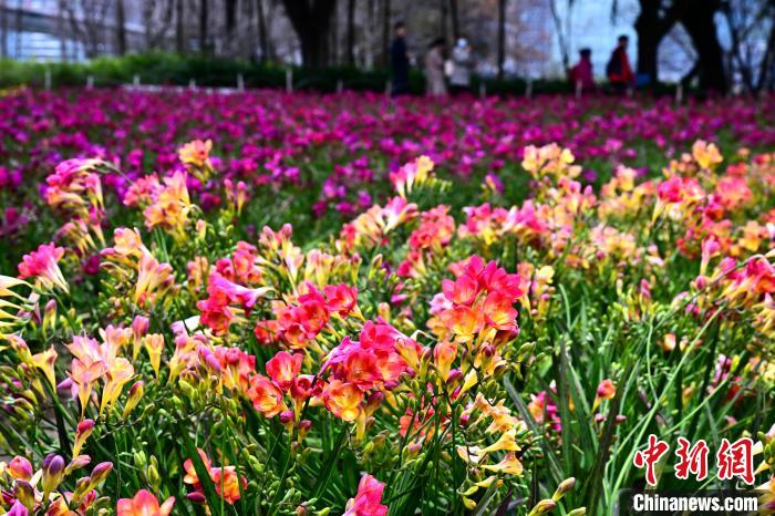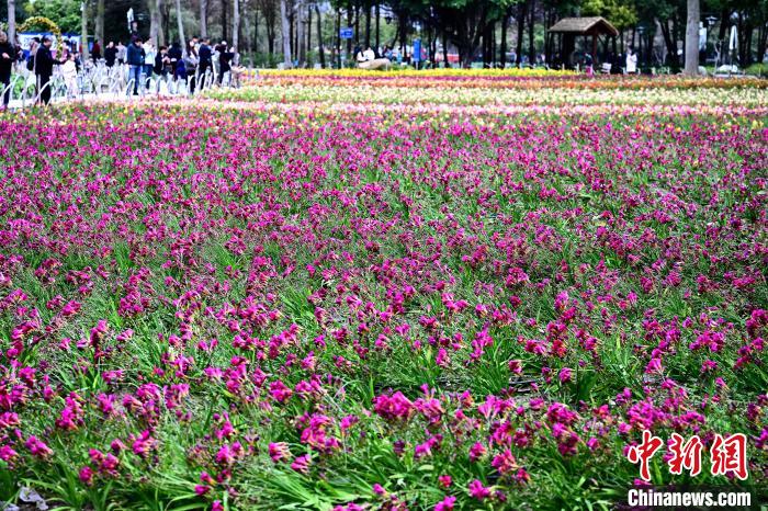 3月16日,游客在公園觀賞小蒼蘭。春日,福州花海公園魯冰花、小蒼蘭、油菜花等鮮花盛放,吸引了許多民眾前來(lái)漫步賞花,享受春天美好時(shí)光。中新社記者 張斌 攝