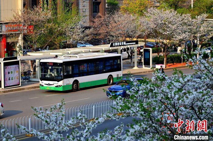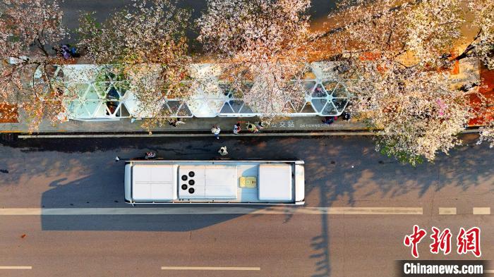 3月26日,被譽為武漢“最美櫻花車站”的珞喻東路大黃村公交站櫻花盛放。經(jīng)過改造的大黃村公交站,新增了自助售貨機、衛(wèi)生間、共享充電寶等便民設(shè)施,煥然一新的科技智慧站臺與粉白如霞的櫻花相映生輝。微風(fēng)吹過,櫻花花瓣浪漫飄零,吸引不少市民游客觀賞“打卡”。圖為公交車在珞喻東路大黃村公交站停留。(無人機照片)劉康 攝