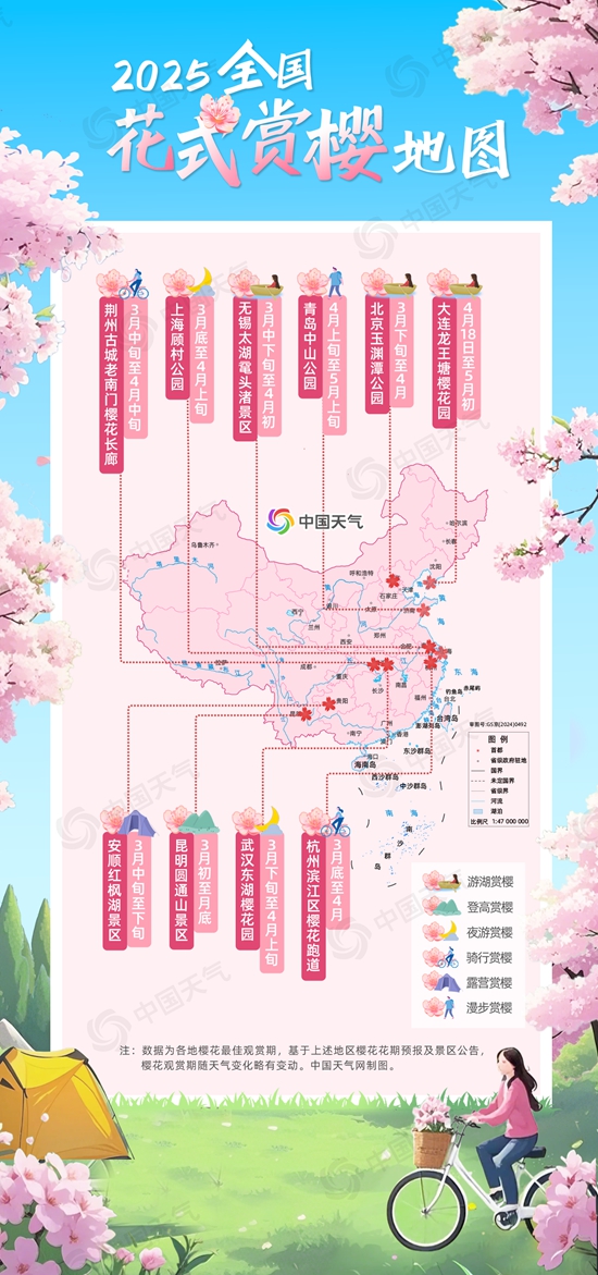 “櫻花紅陌上,柳葉綠池邊。”又是一年櫻花季!今年3月中下旬以來,我國大部經(jīng)歷了大回暖,催動春花盛放,目前武漢、南京等地櫻花已進(jìn)入盛花期,北方多地櫻花也開始迎來觀賞期。中國天氣網(wǎng)特別推出2025全國花式賞櫻地圖,盤點(diǎn)十大賞櫻勝地最佳觀賞期和花式玩法,快來開啟你的賞櫻之旅吧。
