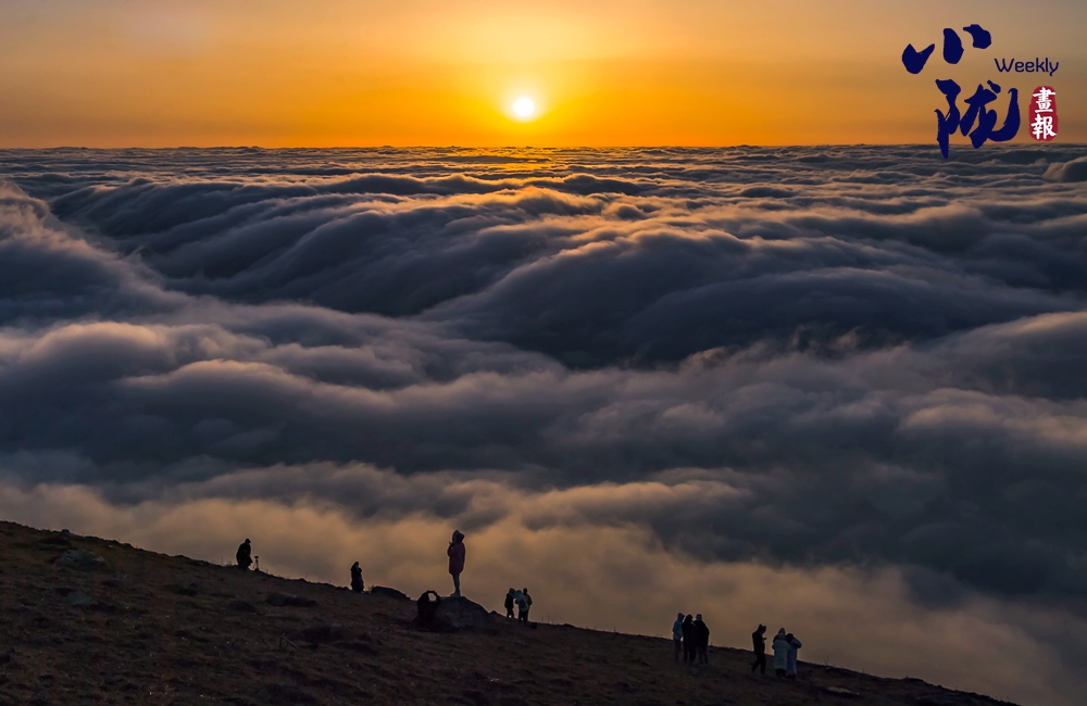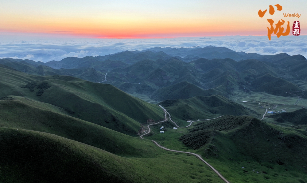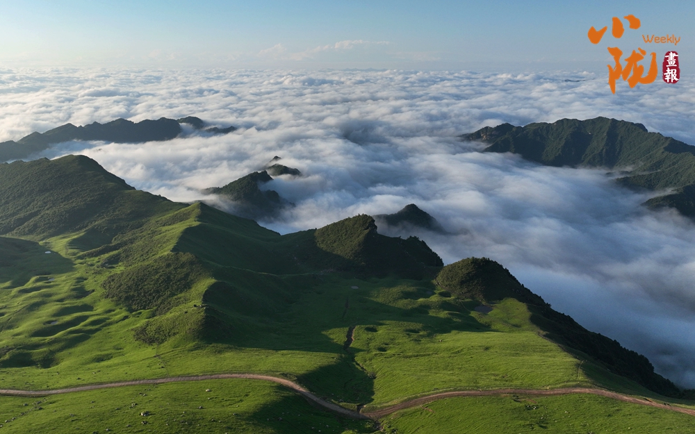 登頂望遠(yuǎn),千壩草原高山、草甸、草原相互交織,牛馬、羊群像一顆顆散落的珍珠點(diǎn)綴其中。茫茫云海鋪滿(mǎn)整個(gè)天際,翻涌的流云大河奔騰,蔚為壯觀(guān),如臨于大海之濱。