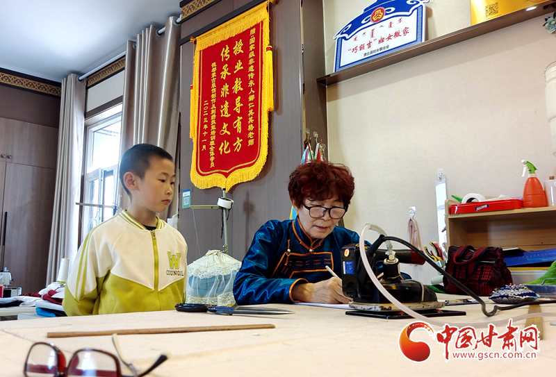 “孩子愛出汗,帽子要輕薄透氣,衣服的花紋要傳統(tǒng)的‘夏格拉繡’”5月18日,在肅北縣蒙古族服飾國家級非遺傳承人娜仁其其格的工作室內(nèi),牧民劉麗青正在為兒子“定制”傳統(tǒng)肅北蒙古族服飾。這件融入現(xiàn)代審美的民族服裝,將成為孩子節(jié)日活動和校園生活中的“文化名片”。