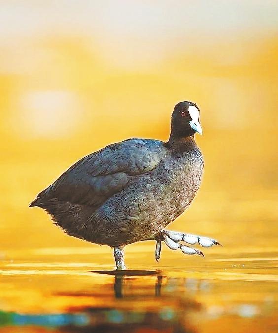 白骨頂又被喚作骨頂雞,卻是鶴類的遠(yuǎn)親。它靜浮水面時(shí),額前一抹象牙白,宛若遺落人間的墨玉鎮(zhèn)紙。這枚額甲實(shí)為特化的角質(zhì)層,是為了保護(hù)頭部的盔胄。灰白色的瓣蹼如雪地靴般包裹趾間,劃開水藻時(shí)泛起粼粼波光——這身黑羽配雪蹼的穿搭,竟比時(shí)裝周的極簡(jiǎn)主義更先鋒。當(dāng)它們列隊(duì)掠過蘆葦蕩,水淼勾勒的剪影里,仿佛在繪制著秋天的信箋。