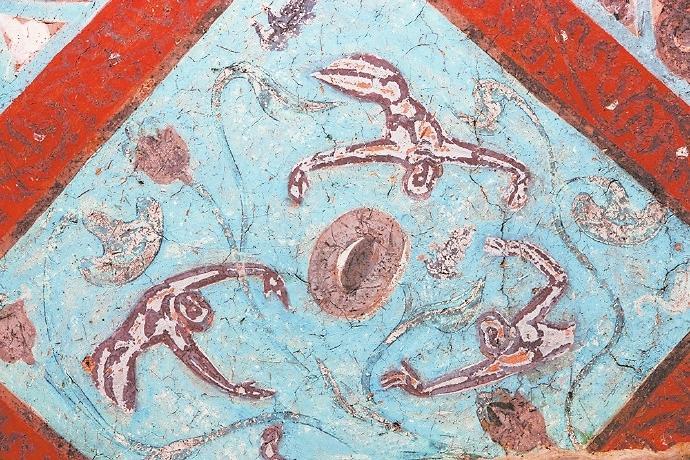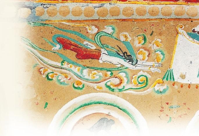 在許多人的認(rèn)知里,飛天是唯美曼妙的化身。在敦煌的許多壁畫(huà)中有大量的飛天形象,但是你知道嗎?在這些壁畫(huà)中除了凌空飛躍的飛天外,還有不少水中的飛天。在莫高窟第329窟壁畫(huà)中有一幅“潛水式飛天圖”:畫(huà)面中的一位飛天身著赭紅色長(zhǎng)裙,藍(lán)色飄帶纏身,雙手伸展前伸,似乎正在水中遨游。畫(huà)面唯美而靈動(dòng),在曼妙中透著健碩,使人過(guò)目難忘。
