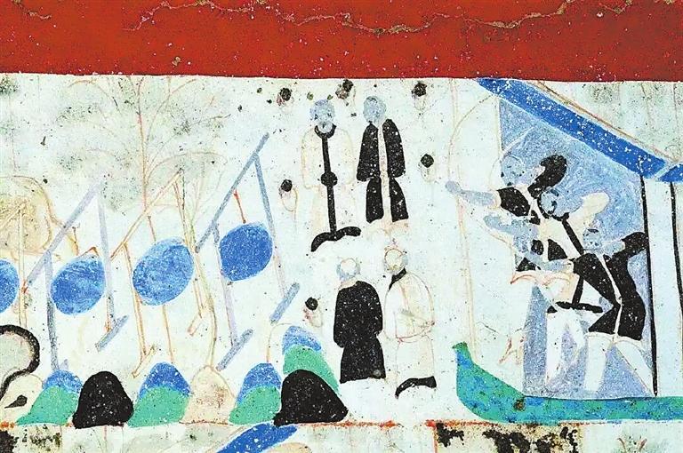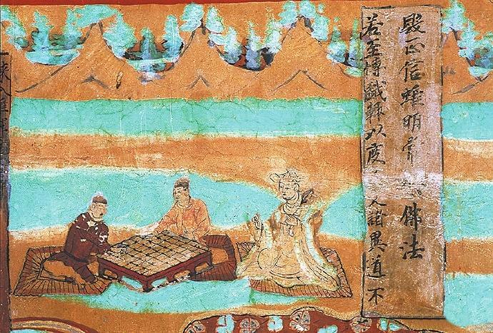 在敦煌壁畫(huà)中有關(guān)對(duì)弈的內(nèi)容較多。在莫高窟第454窟、第7窟壁畫(huà)中都有“弈棋圖”。兩幅圖的畫(huà)面有不少類(lèi)似的地方:一是畫(huà)師較為突出棋盤(pán)的位置,兩幅壁畫(huà)中的棋盤(pán)都居中且形制相對(duì)巨大;二是畫(huà)面上的人物均為三人,兩人對(duì)弈,一人觀戰(zhàn),“觀棋不語(yǔ)真君子”;三是對(duì)弈者身后的景色都是天朗氣清、遠(yuǎn)山含黛。據(jù)說(shuō),一天,北宋大文豪蘇東坡與摯友黃庭堅(jiān)正在松樹(shù)底下弈棋。一陣風(fēng)吹來(lái),松果掉進(jìn)棋盤(pán)。蘇東坡隨即吟道:“松下圍棋,松子每隨棋子落。”黃庭堅(jiān)馬上回答道:“柳邊垂釣,柳絲常伴釣絲懸。”雅趣十足。其實(shí),棋局里的一動(dòng)一靜、一招一式無(wú)不需要謹(jǐn)小慎微、穩(wěn)扎穩(wěn)打。而對(duì)弈時(shí)的當(dāng)斷則斷、示假隱真、有效合作等戰(zhàn)術(shù)不僅是對(duì)弈的智慧,也是人生的哲理吧。