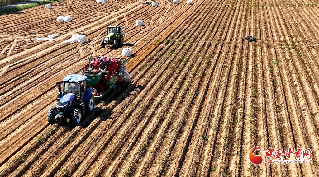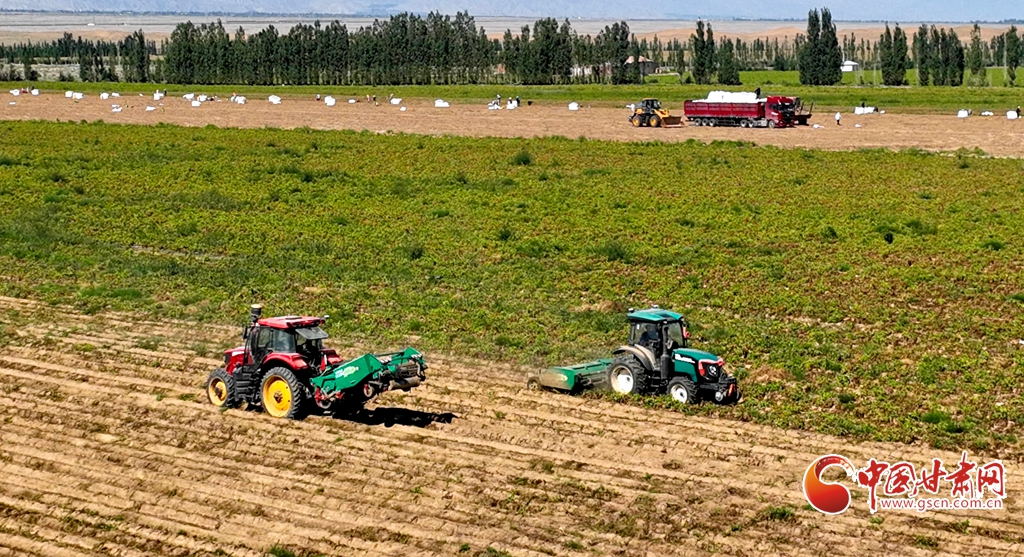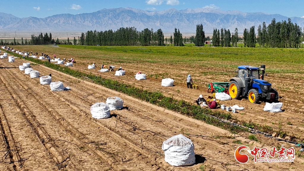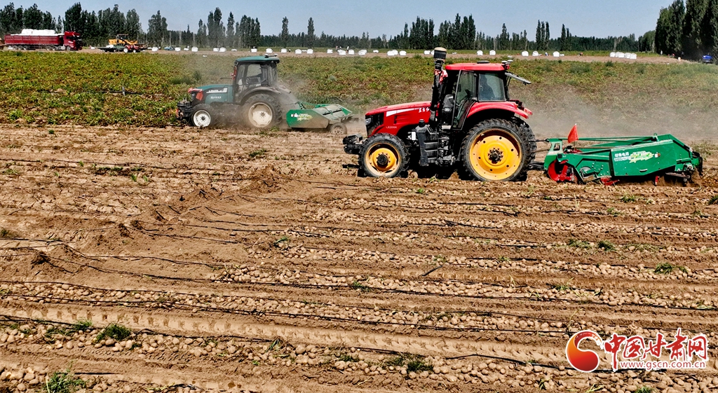 8月14日,祁連山下的張掖市高臺(tái)縣新壩鎮(zhèn)馬鈴薯種植基地一片繁忙。收獲機(jī)在田間穿梭,碩大的馬鈴薯破土而出,工人們正加緊進(jìn)行撿拾、分揀和裝車(chē)。