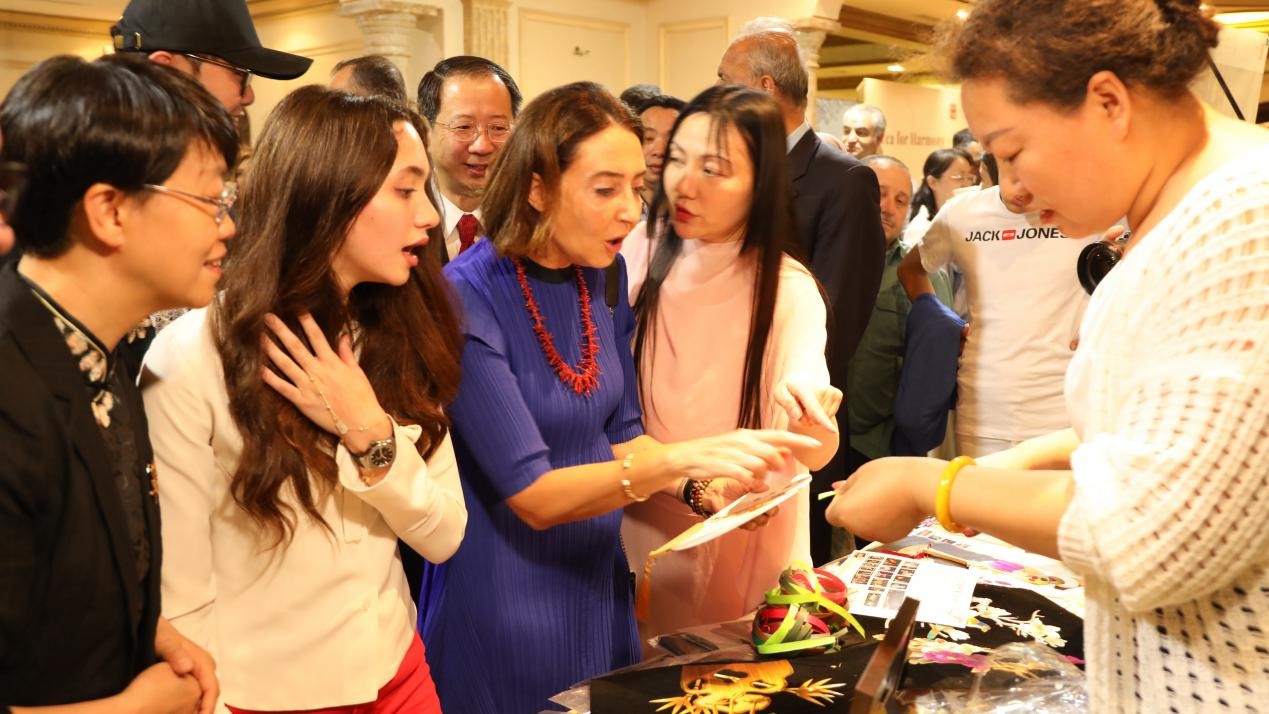 在今年5月18日“茶和天下——甘肅文旅推廣”安曼現(xiàn)場(chǎng),唐彩萍現(xiàn)場(chǎng)制作的麥桿畫以獨(dú)特魅力驚艷全場(chǎng),約旦王妃和加莉拉公主被其精湛的工藝深深吸引,親自上手體驗(yàn)后豎起大拇指稱她是“奇人”。今年6月在“根與魂——甘肅省非遺澳門展演會(huì)”上,唐彩萍制作的麥桿畫《和平鴿》《中國龍》贏得與會(huì)人士的高度贊賞,澳門特別行政區(qū)政府文化局局長梁惠敏稱贊其“不同凡響,值得傳承發(fā)揚(yáng)”,并當(dāng)場(chǎng)邀請(qǐng)?zhí)撇势紴榘拈T小朋友傳授麥桿畫的制作方法。