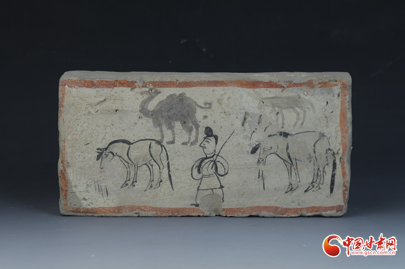 而在眾多璀璨的壁畫(huà)磚中,一件名為《牧馬、駱駝圖壁畫(huà)磚》的館藏一級(jí)文物,在美術(shù)界引發(fā)了強(qiáng)烈反響。這件壁畫(huà)磚現(xiàn)收藏于高臺(tái)縣博物館,畫(huà)面中央繪有一位身著交領(lǐng)短衫、緊腰束帶的牧人,他手執(zhí)長(zhǎng)鞭,正在悠然放牧。草地上,馬群、駱駝、毛驢等牲畜或低頭覓食,或悠然自得。