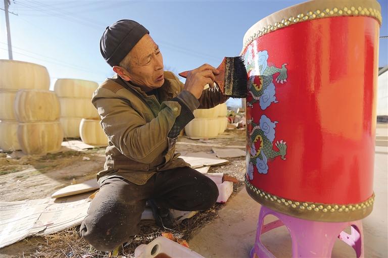 手工藝人周天成給牛皮鼓刷清漆