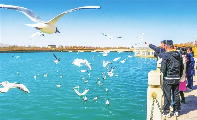 現(xiàn)在一到春天,嘉峪關(guān)市就會(huì)迎來一大批特殊的“訪客”——遺鷗、紅嘴鷗、漁鷗成群結(jié)隊(duì),或翱翔于湛藍(lán)天空,或嬉戲于碧波之上。游客、市民爭(zhēng)相前往觀賞千鳥齊翔的震撼場(chǎng)景,一幅人與自然和諧相處的美好畫卷躍然眼前。