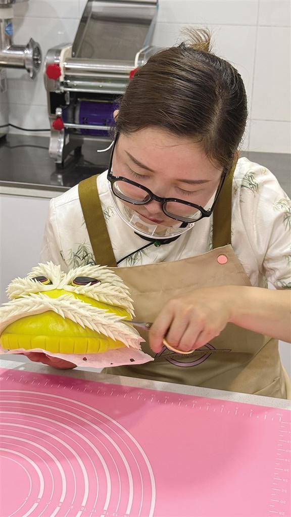走進(jìn)楊曉蘭的花饃小店,濃郁面香裹挾著藝術(shù)氣息撲面而來(lái)。展架上,威風(fēng)凜凜的醒獅昂首欲嘯,憨態(tài)可掬的卡通角色惹人喜愛(ài),盤(pán)踞的靈蛇栩栩如生……此刻,她正凝神制作醒獅花饃,搓、捏、塑形,面團(tuán)在她指尖迅速呈現(xiàn)出獅頭的威武雛形。
