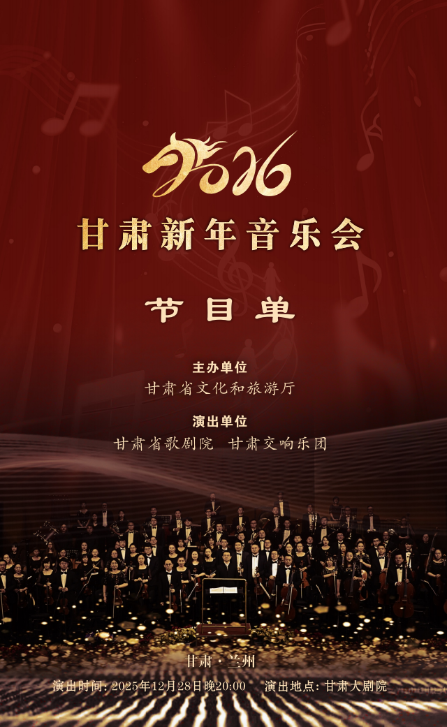 中國甘肅網(wǎng)12月24日訊(西北角·中國甘肅網(wǎng)記者 任磊)2026甘肅新年音樂會將于12月28日晚在甘肅大劇院奏響。本場音樂會由甘肅省文化和旅游廳主辦,甘肅省歌劇院、甘肅交響樂團(tuán)承辦,將以一場中西合璧、氣勢恢宏的交響盛宴,為金城觀眾獻(xiàn)上誠意滿滿的新年祝福。