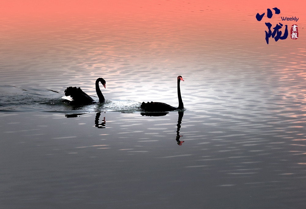 水面平靜如鏡,野生黑天鵝舒展雙翼,揚(yáng)著頸脖,在水中游弋劃波,時(shí)而低頭覓食,時(shí)而相互依偎,成雙成對(duì)上演冬日浪漫。